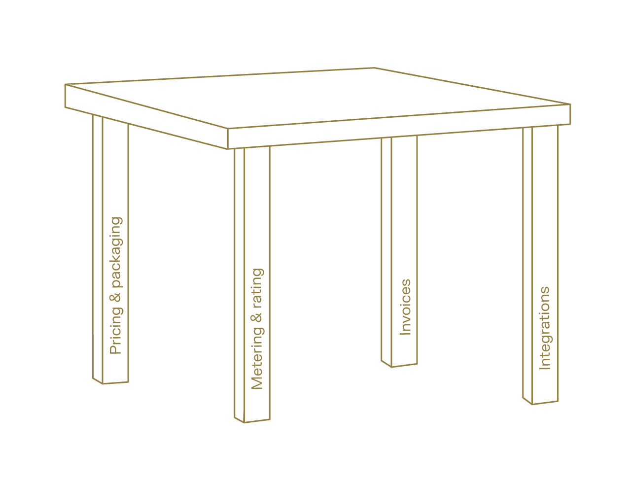 A billing system could be compared to a table where the legs are different parts of the billing stack. One leg of the table is for pricing and packaging, another for metering and rating, etc. If you want to introduce a new pricing model, that is sort of like increasing the height of the table. Every leg’s length must be increased somehow so the table can still function. You can prop up one leg as a temporary solve, but this could compromise the structure of the table. The prop might not hold as much weight or be slightly off in sizing—causing future issues down the road and result in revenue "sliding off the table" if you'll indulge the metaphor.